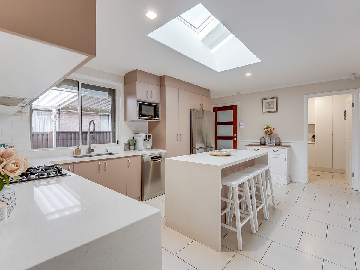 The modern kitchen offers 40mm stone tops with waterfall edges, raked ceiling with skylight and new sink.