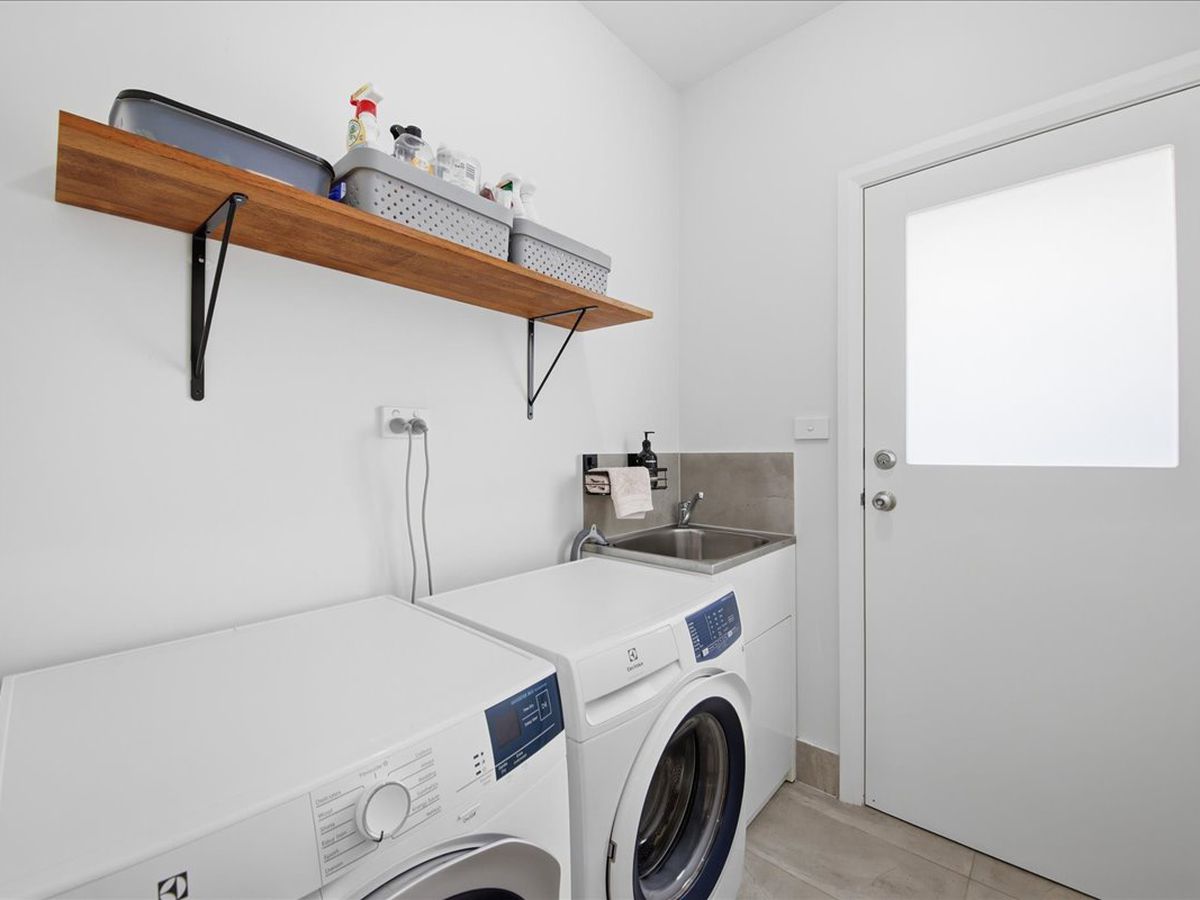 The spacious living zones include a large lounge and dining area flowing from the galley-style kitchen, showcasing stone benchtops, quality stainless steel appliances, and a stylish feature window.